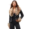 - Asymmetrical front zipper and wide lapel design embody classic biker aesthetics.