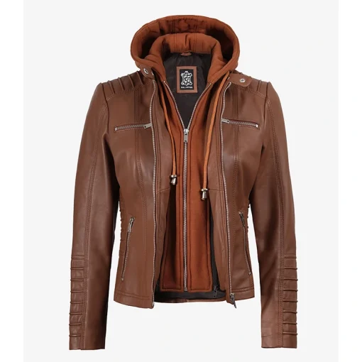 Women’s Cognac Brown Leather Jacket With Removable Hood